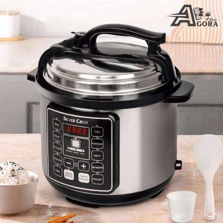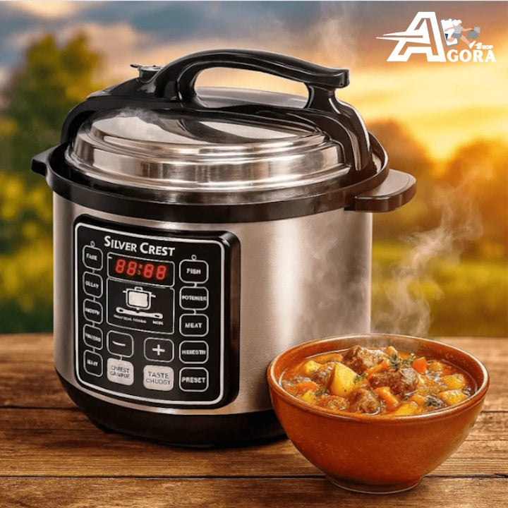 Električni pretis lonac Silver Crest savršen je izbor za sve koji žele brzo, jednostavno i ukusno pripremati jela. Zahvaljujući naprednoj tehnologiji kuhanja pod pritiskom, hrana se priprema znatno brže, a pritom zadržava puni okus i hranjive sastojke. Moderan dizajn od nehrđajućeg čelika i više funkcija kuhanja čine ga nezamjenjivim pomoćnikom u svakoj kuhinji — bilo da kuhate supu, meso, rižu ili variva.