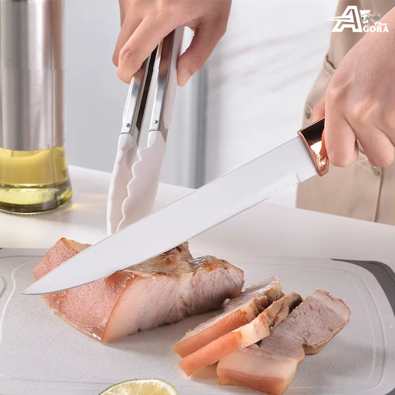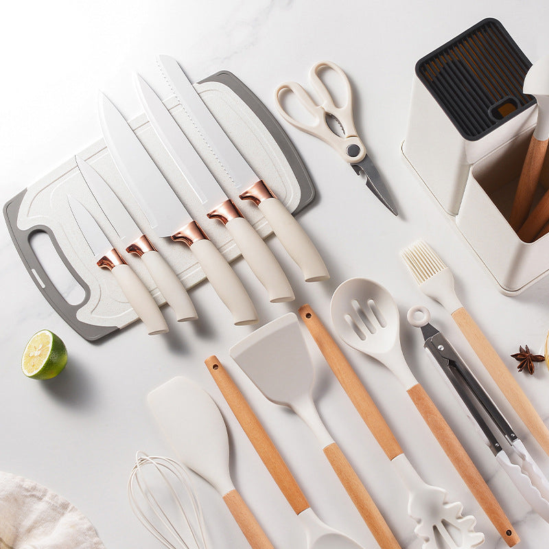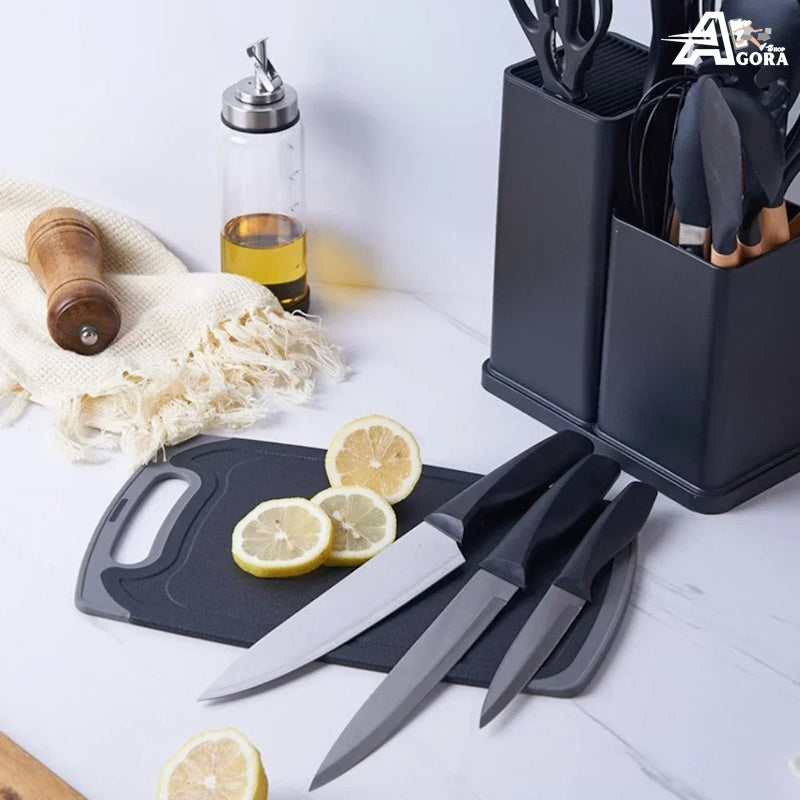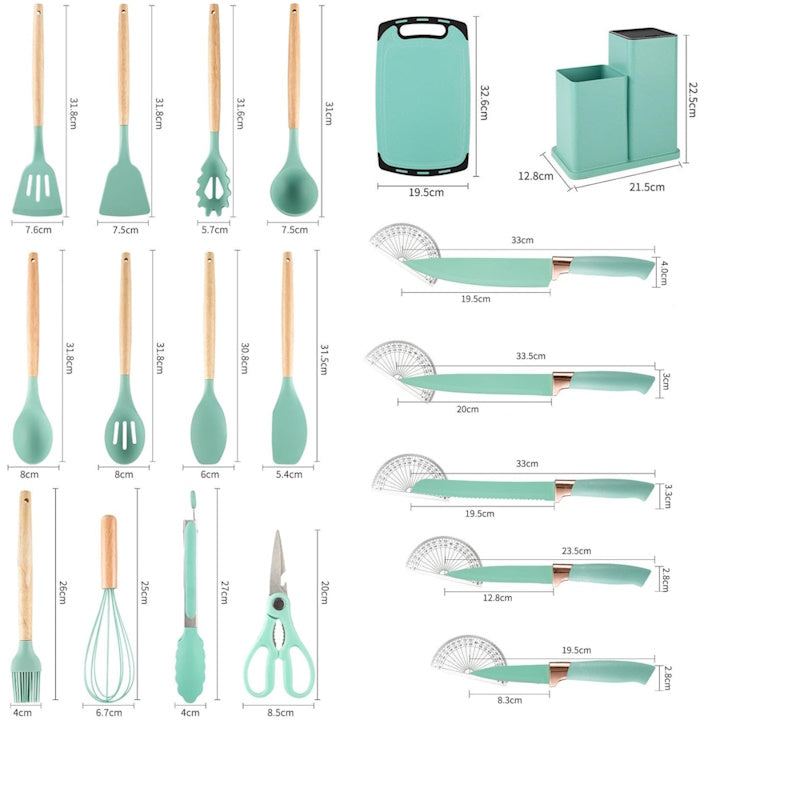 Unesite red, stil i praktičnost u svoju kuhinju uz premium kuhinjski set 19u1! Ovaj komplet sadrži sve što vam je potrebno – 5 različitih noževa, 11 kuhinjskih pomagala, dasku i makaze za sječenje, sve uredno složeno u modernu i elegantnu kutiju. Izrađen od visokokvalitetnog silikona i nerđajućeg čelika, otporan je na visoke temperature i siguran za perilicu suđa. Zahvaljujući praktičnom dizajnu, štedi prostor i olakšava svakodnevno kuhanje