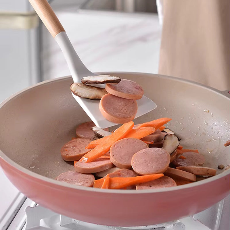 Izrađen od visokokvalitetnog silikona i ojačanih drvenih drški, ovaj set garantuje dugotrajnost i sigurnost u upotrebi. Silikonske glave su otporne na visoke temperature, ne tope se i ne oštećuju neprianjajuće tave, što ga čini idealnim za svaku vrstu kuvanja.