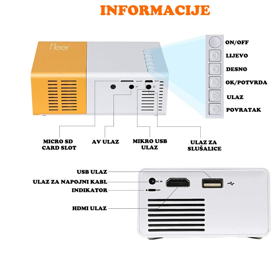 Pretvorite svaku prostoriju u pravi kućni bioskop uz mini LED prijenosni projektor! Zahvaljujući kompaktnom dizajnu i snažnoj LED tehnologiji, ovaj uređaj pruža jasnu i živopisnu sliku u Full HD (1080p) rezoluciji. Savršen je za gledanje filmova, serija, prezentacije, kao i za povezivanje s pametnim telefonima, tabletima, laptopima ili TV uređajima. Uvijek uz vas i pri ruci, bez zauzimanja dragocenog prostora.