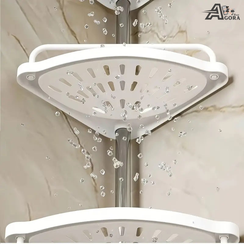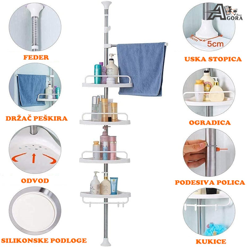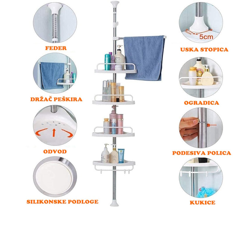 Ovaj ugaoni stalak ima četiri police s rupicama za odvod, pa voda ne ostaje na policama i stvari ostaju suhe. Svaka polica ima ogradu koja sprječava pad predmeta, a dodatno stalak dolazi s držačem za peškir i kukicama za spužve i druge dodatke za kupanje.